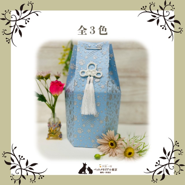 人気の高いかわいらしい巾着型のお骨袋。虹色の飾りがお骨壷の周りを彩っています。 ※ご注文のタイミングで品切れとなっている場合がございます。ご了承ください。