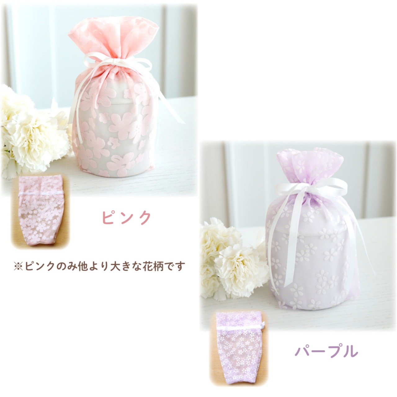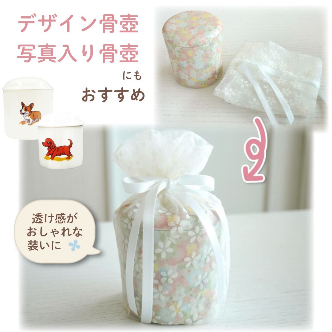 美しい透け感のある小花柄のかわいい骨壷カバーです。素敵なあの子を柔らかくつつみます。春夏のお着替えにもぴったりです。写真入り骨壷やデザイン骨壷にもおすすめです。