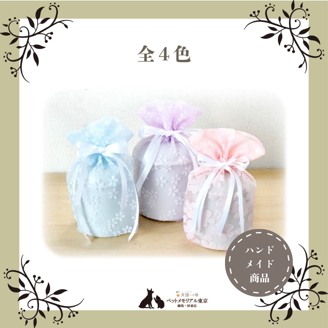 美しい透け感のある小花柄のかわいい骨壷カバーです。素敵なあの子を柔らかくつつみます。春夏のお着替えにもぴったりです。写真入り骨壷やデザイン骨壷にもおすすめです。