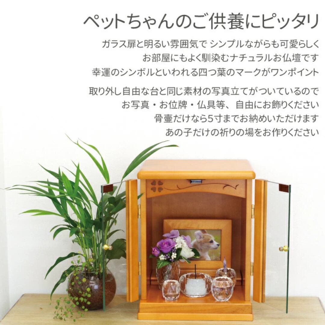 いつものお部屋にも置きやすい、シンプルながらも愛らしさのあるペット仏壇。 ペット骨壷だけなら5寸、骨袋ごとなら4寸の骨壷をおさめることができます。 ガラス扉なので明るい雰囲気で、いつでも中のお位牌やお写真を見ることができます。 大好きなペットちゃんのための、専用の仏壇です。