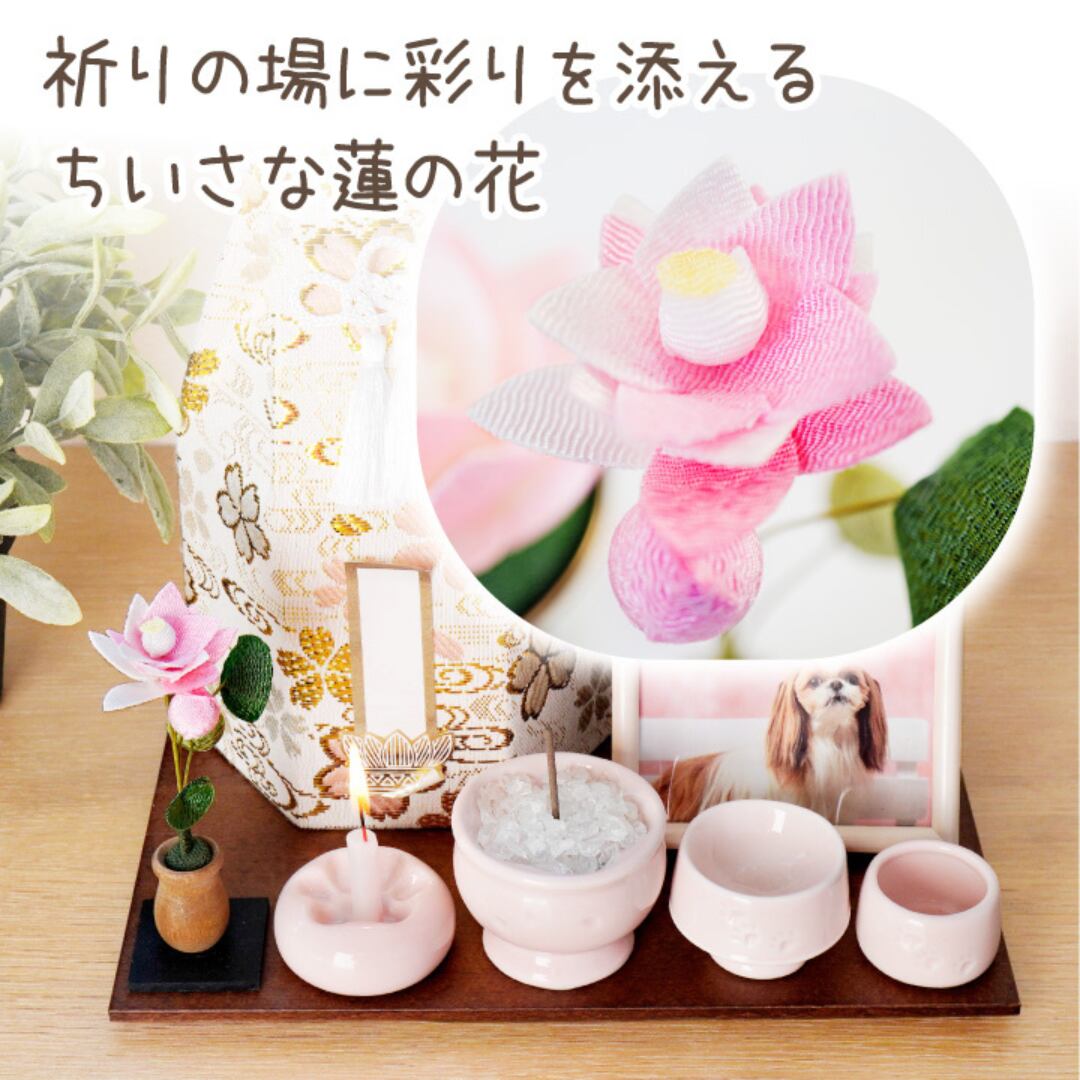 祈りの場に彩りを添える、ちいさな蓮の花のオブジェです。ほっこりとした印象のちりめん細工ででお作りしました。