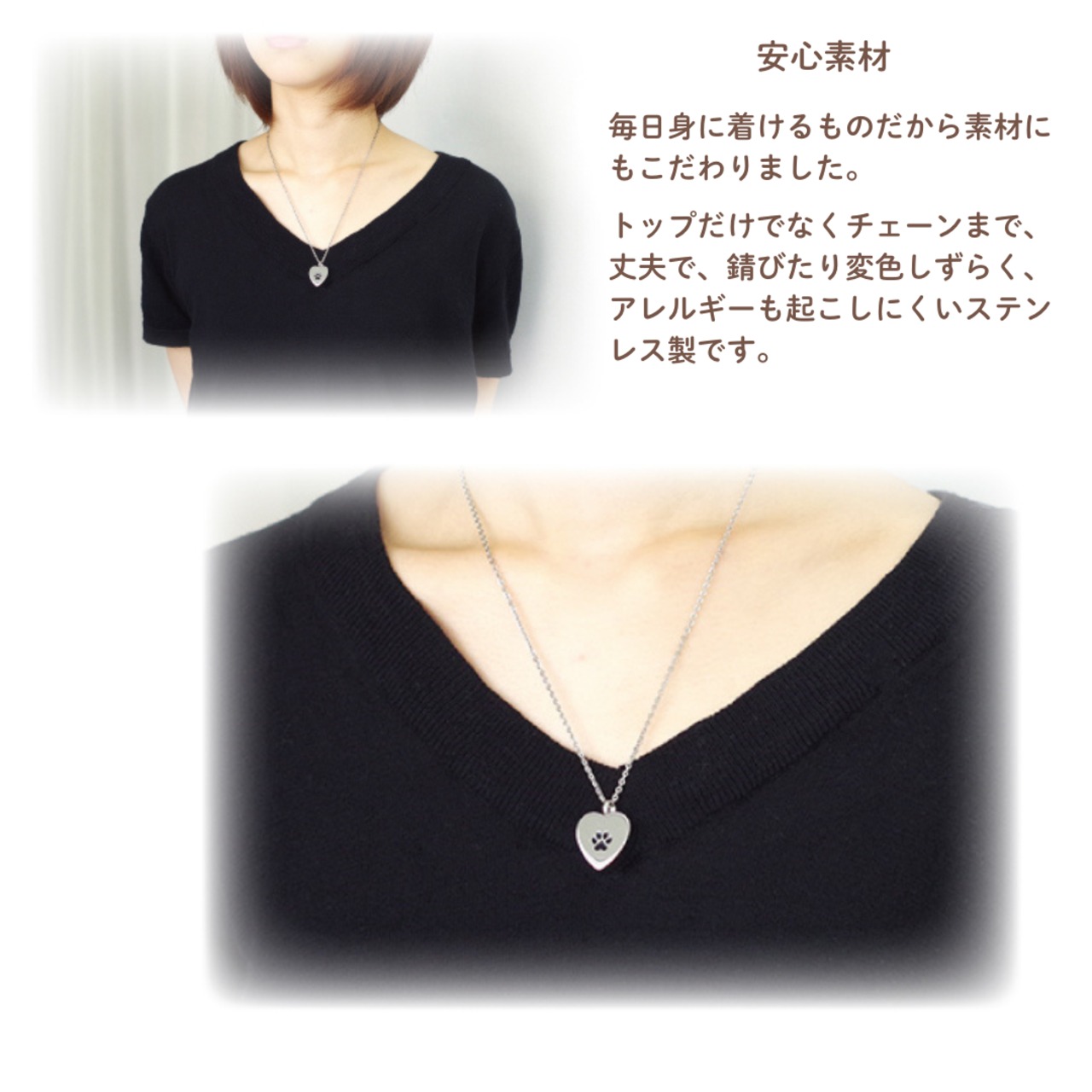 ペンダントはチェーンもステンレス製ですので、アレルギーを起こしにくい素材になっています。