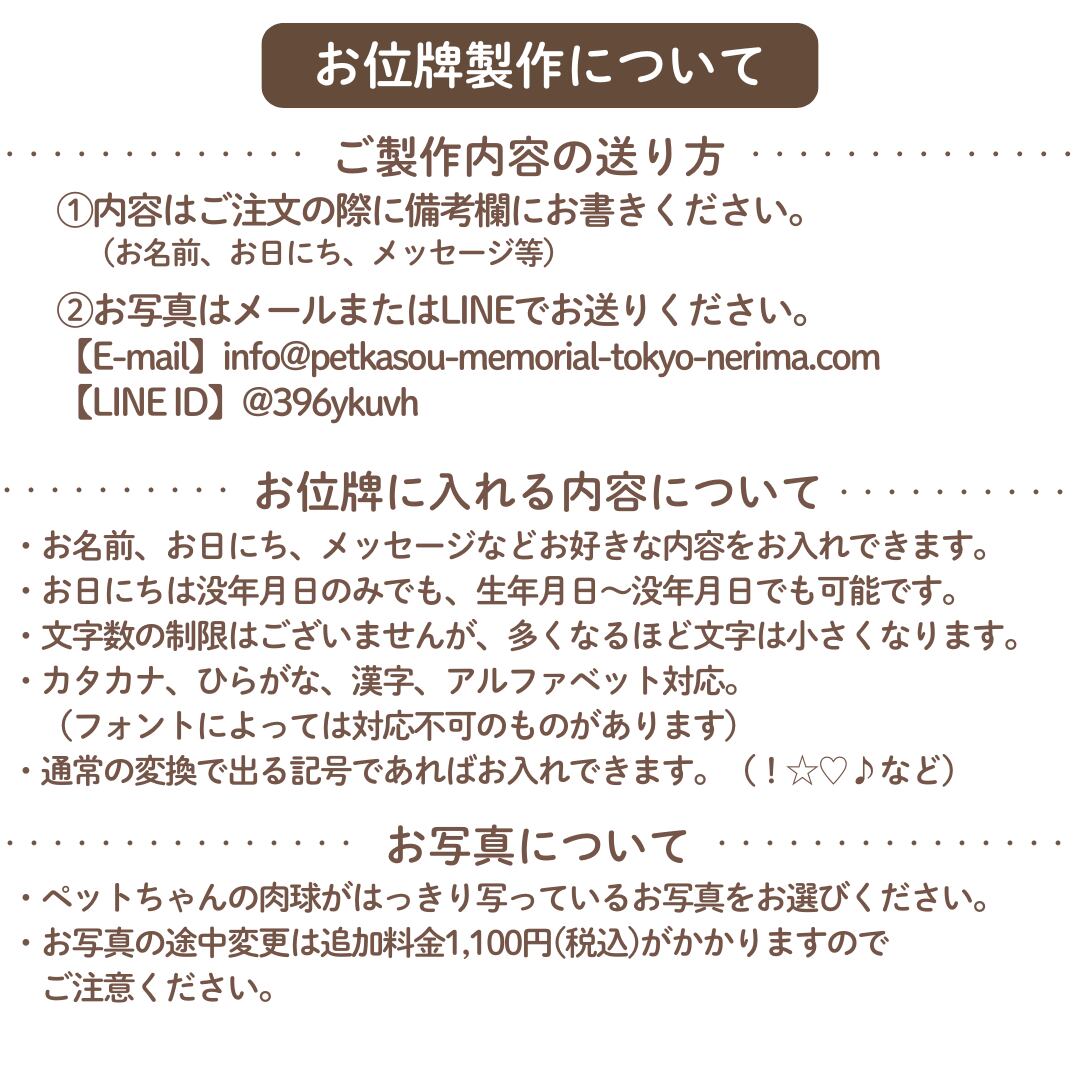 お好きなメッセージなどもお入れできますので、大事なペットちゃんのための、世界で1つのお位牌をお作りいただけます。