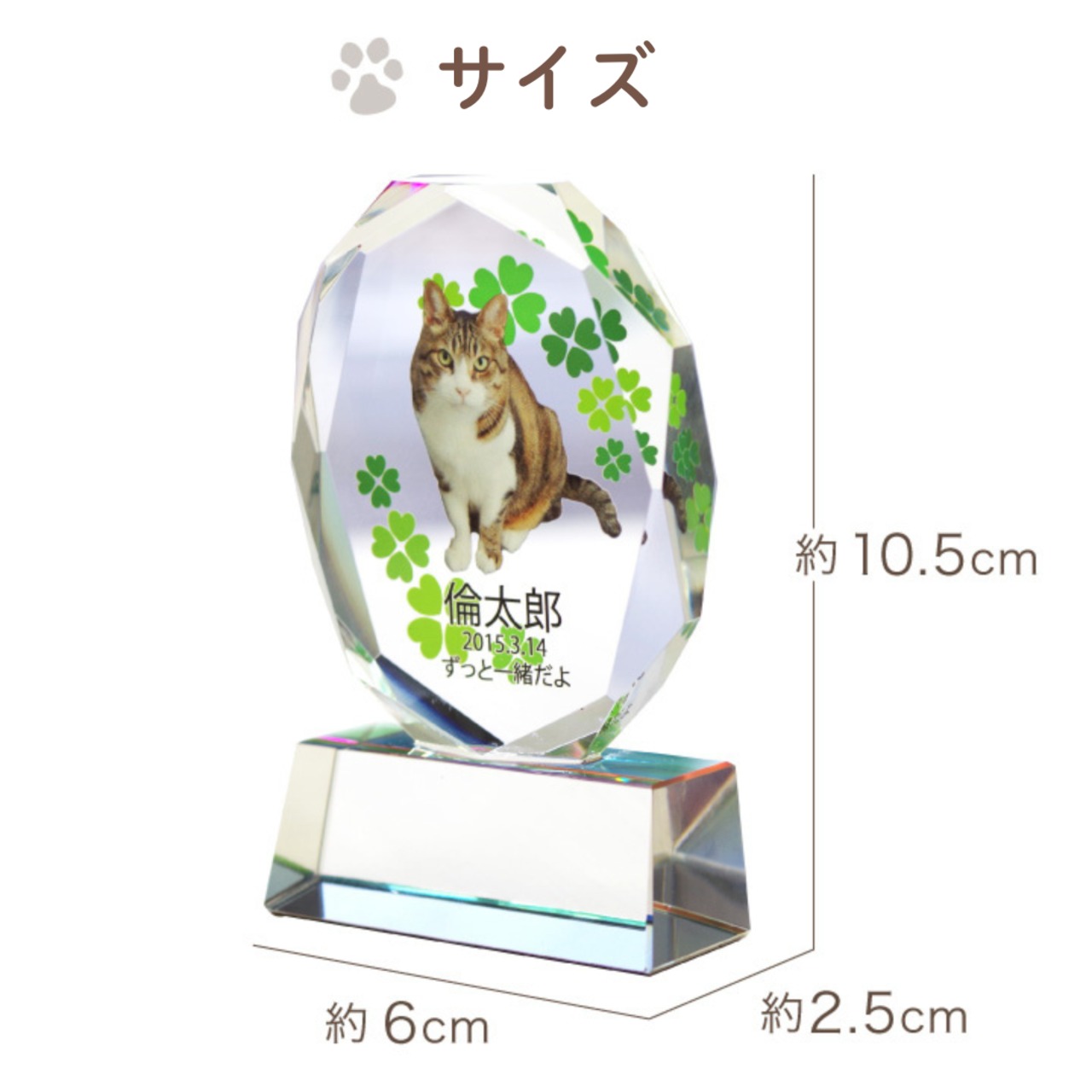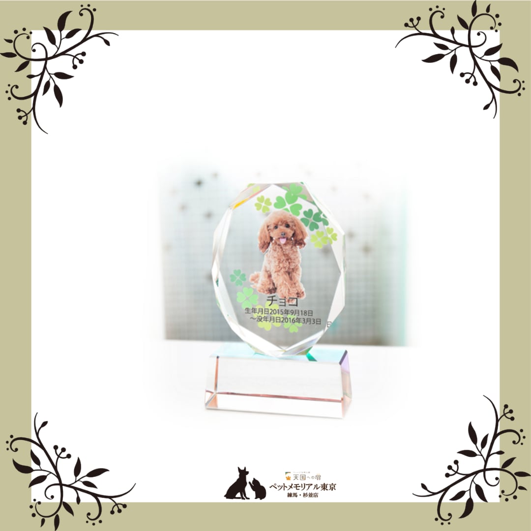 ペットちゃんのお気に入りの一枚と、お名前、日付、メッセージなどを入れられるクリスタルのお位牌です。