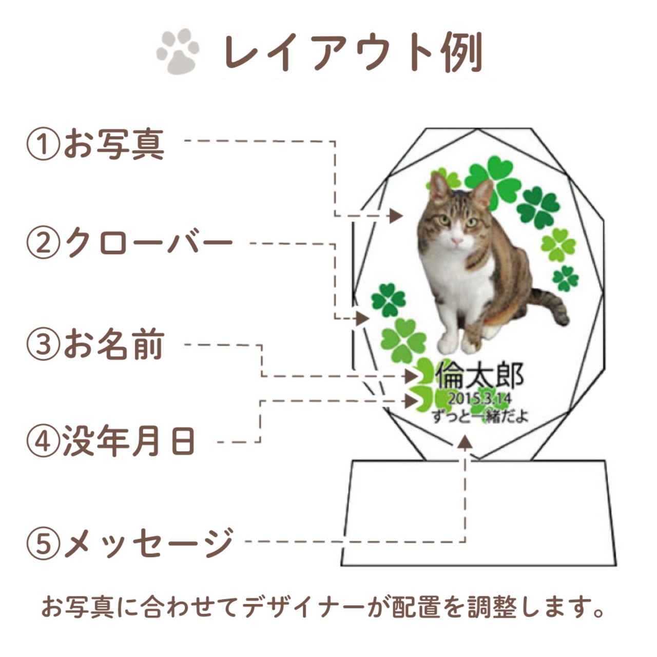 お空でのペットちゃんの幸せを願う、四つ葉のクローバーのモチーフが、ペットちゃんを可愛く彩ります。