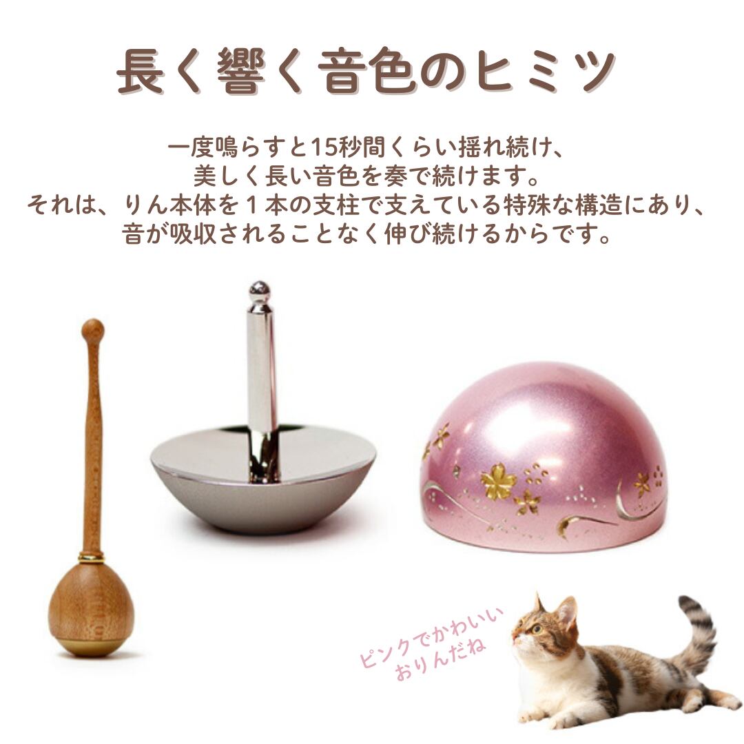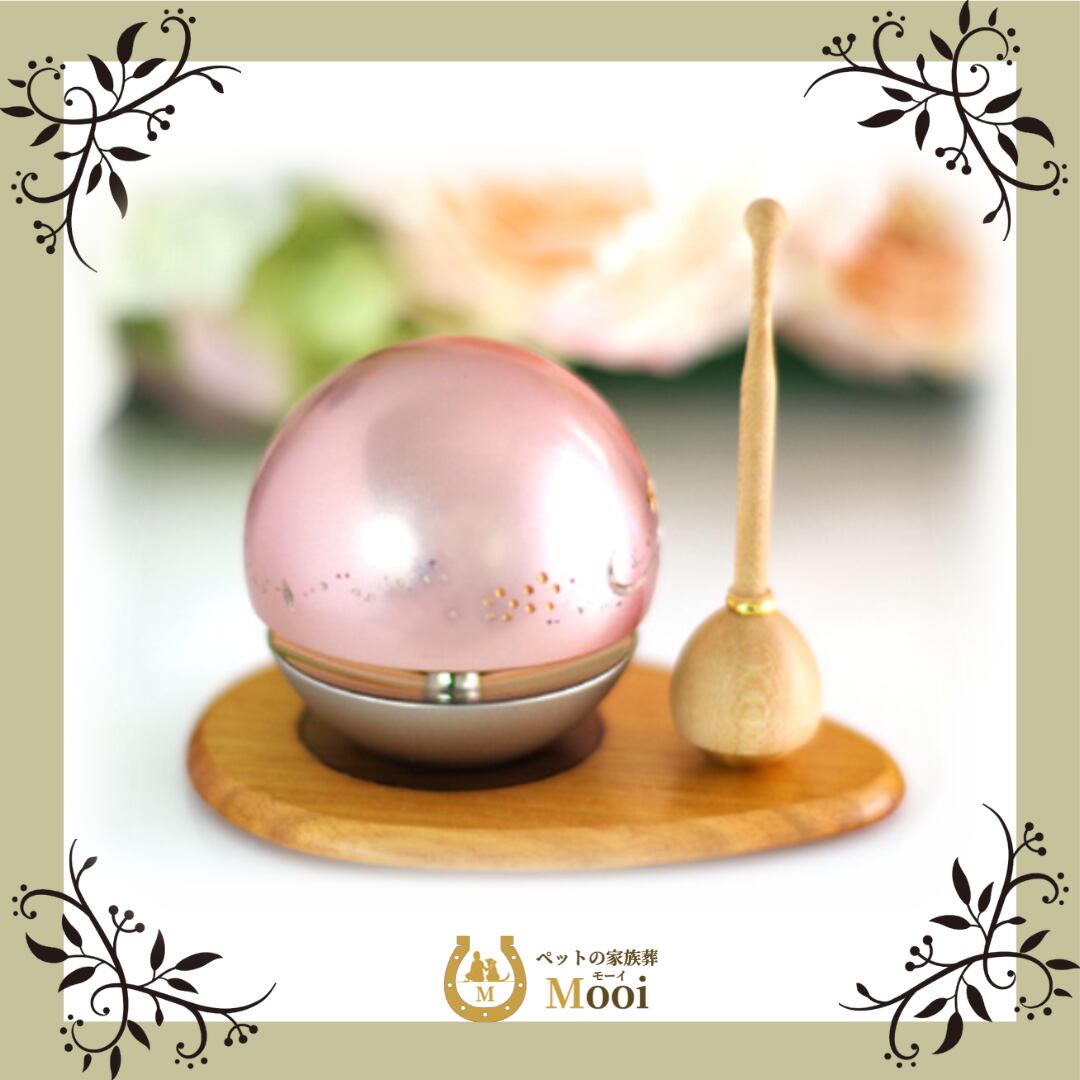 ゆらゆらと揺れながら美しい音色を奏でる、本格的だけどかわいらしいおりんです。ピンクが似合うペットちゃんのご供養に。納骨堂やちょっとしたスペースでもお使いいただきやすいコンパクトサイズです。