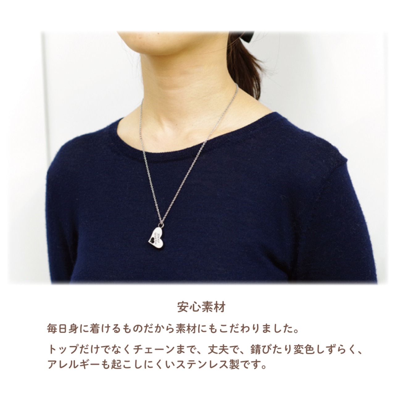 ペンダントはチェーンもステンレス製ですので、アレルギーを起こしにくい素材になっています。