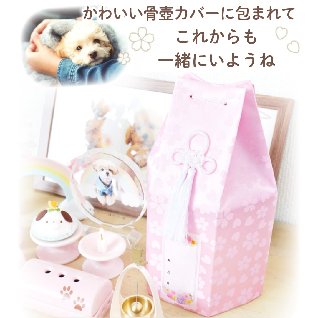 パステルカラーとさくら&ハート模様がかわいい、ペットちゃんにぴったりの骨袋です。特別なあの子のお骨壷をやさしく包みます。