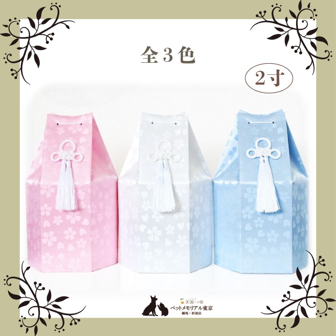 パステルカラーとさくら&ハート模様がかわいい、ペットちゃんにぴったりの骨袋です。特別なあの子のお骨壷をやさしく包みます。