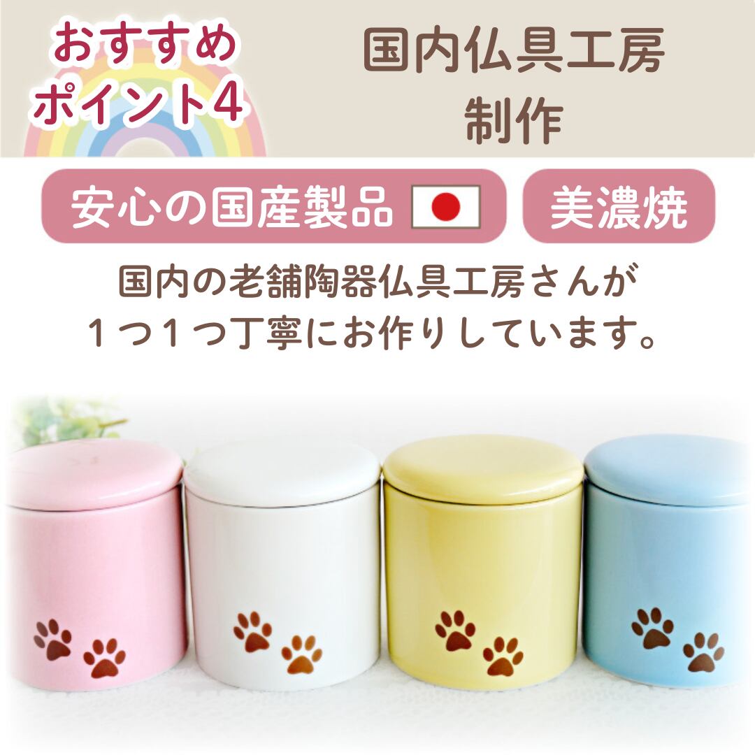 国産のしっかりしたミニ骨壷ですので、安心してペットちゃんのお骨や毛などをおさめていただけます。