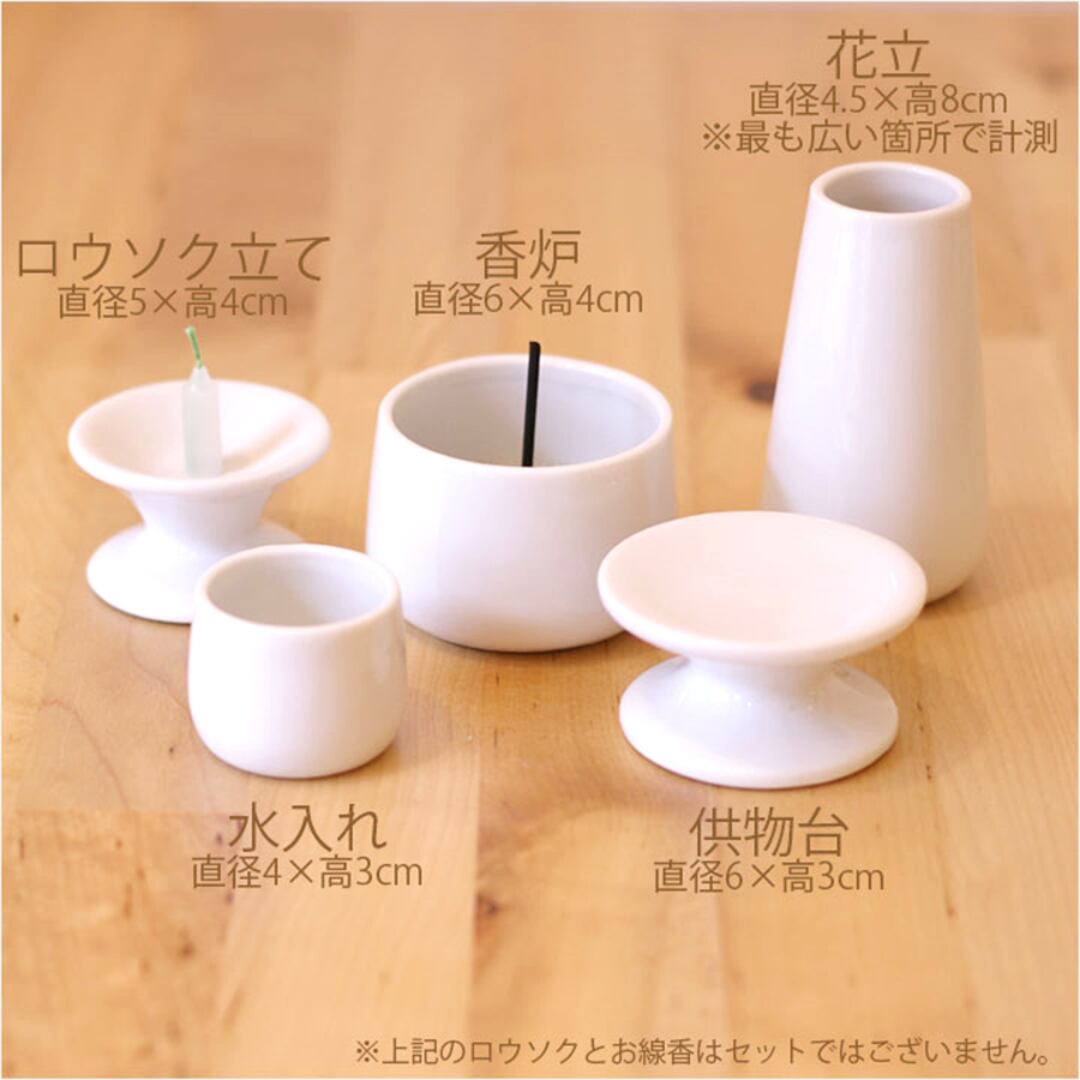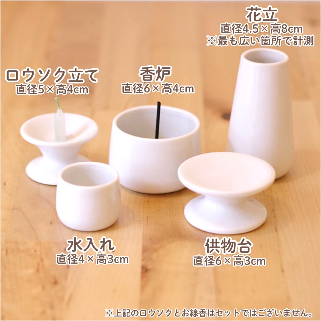 花立:幅4.5×高8cm / 水入れ:幅7×高2.5cm / 供物台:幅6×高3cm / ろうそく立て:幅5×高4cm / 香皿:幅9.1×高4×奥行4.6cm