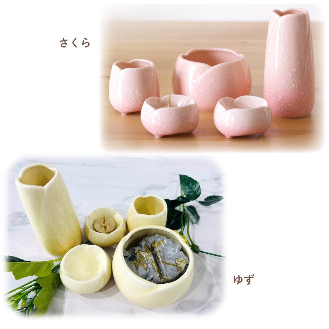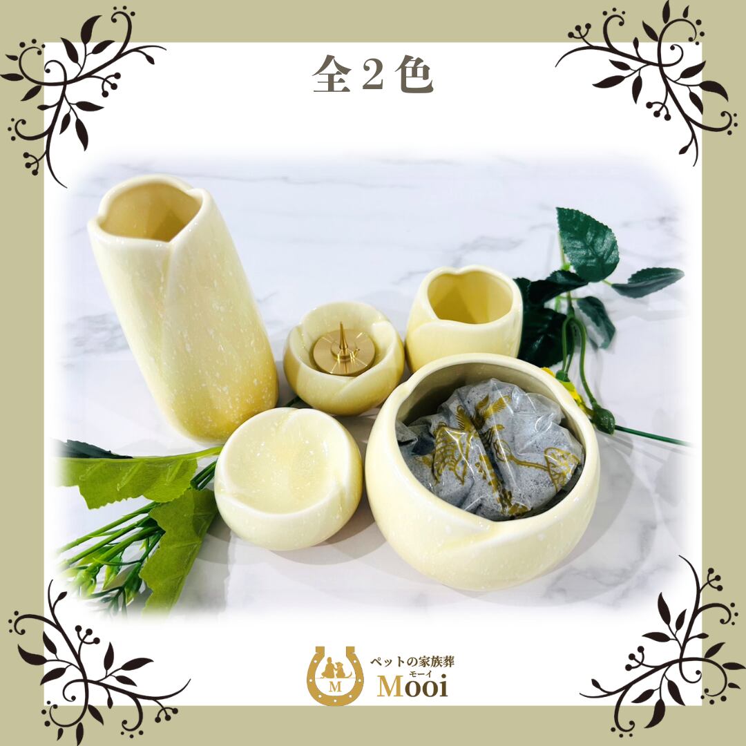 お花をイメージした丸みのある形と優しい色合いが特徴の日本製・陶器ペット仏具セットです。本格香炉灰も一緒にお届け。ペットちゃんのためにきちんと供養できる仏具セットです。