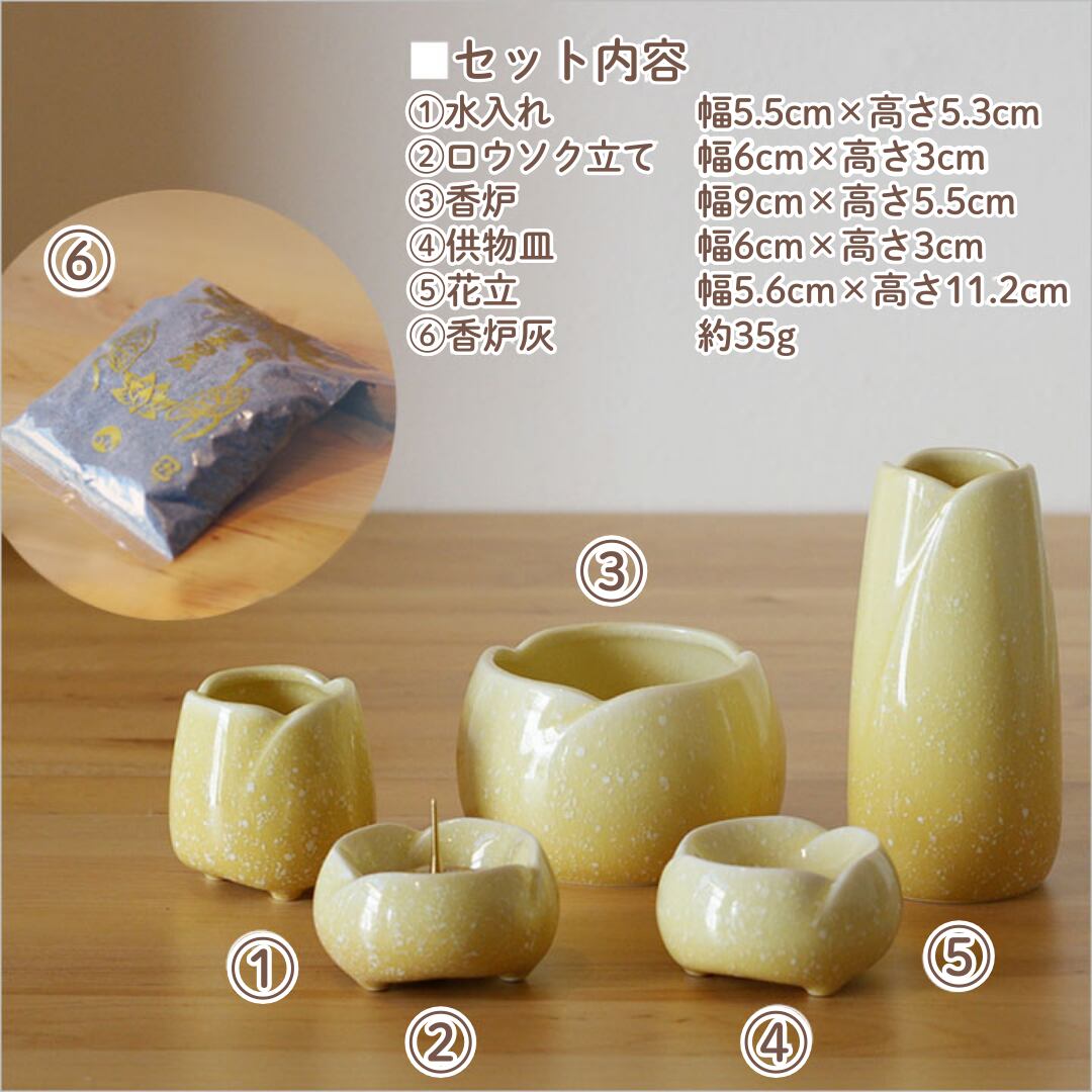 花立:幅5.6×高11.2cm / 水入れ:幅5.5×高5.3cm / 供物台:幅6×高3cm / ろうそく立て:幅6×高3cm / 香炉:幅9×高5.5cm