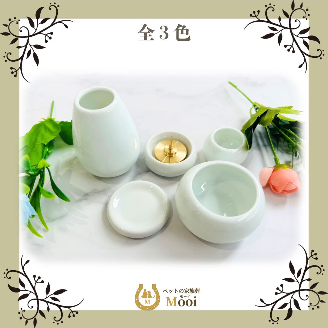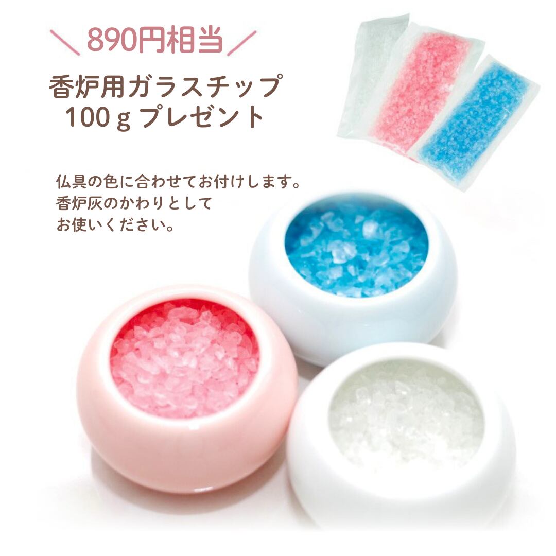 まぁるいフォルムのかわいらしさがペットちゃんの供養にぴったりな、安心の国産仏具セットです。仏具の色に合わせガラスチップ100gプレゼント中です。
