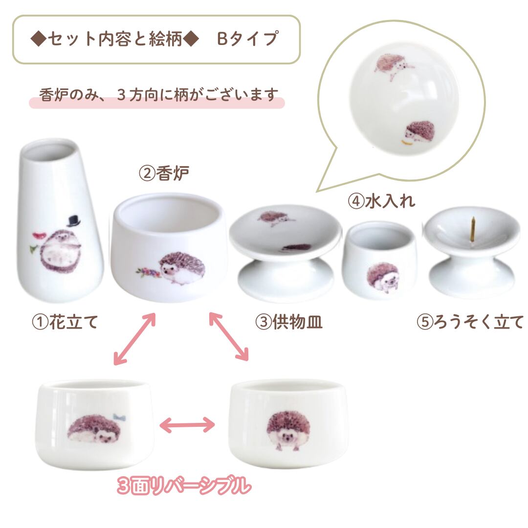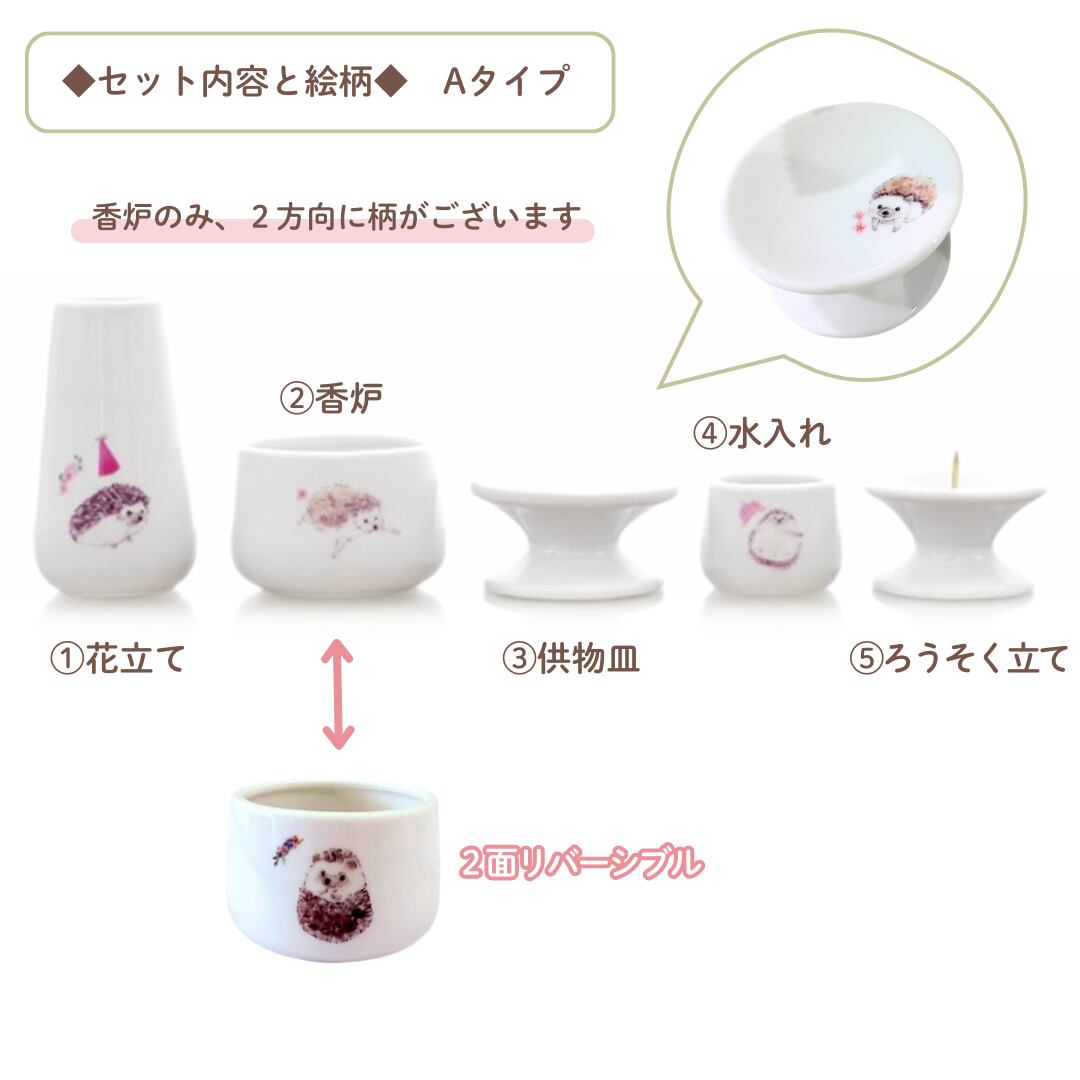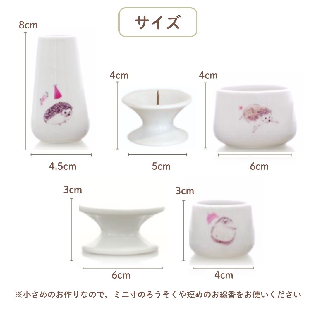 大事なハリネズミちゃんのご供養にお使いいただきたい、ハリネズミちゃんが楽しく過ごしているかわいいイラスト入りの国産仏具5点セットです。職人が1つ1つ丁寧にお作りしています。