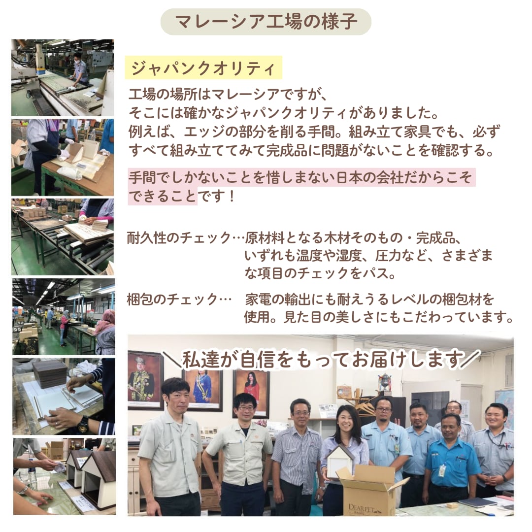 大切なお子さまにふさわしい安心できる居場所となるように、現地マレーシアの工場見学をし確かな品質であることを確認しております。