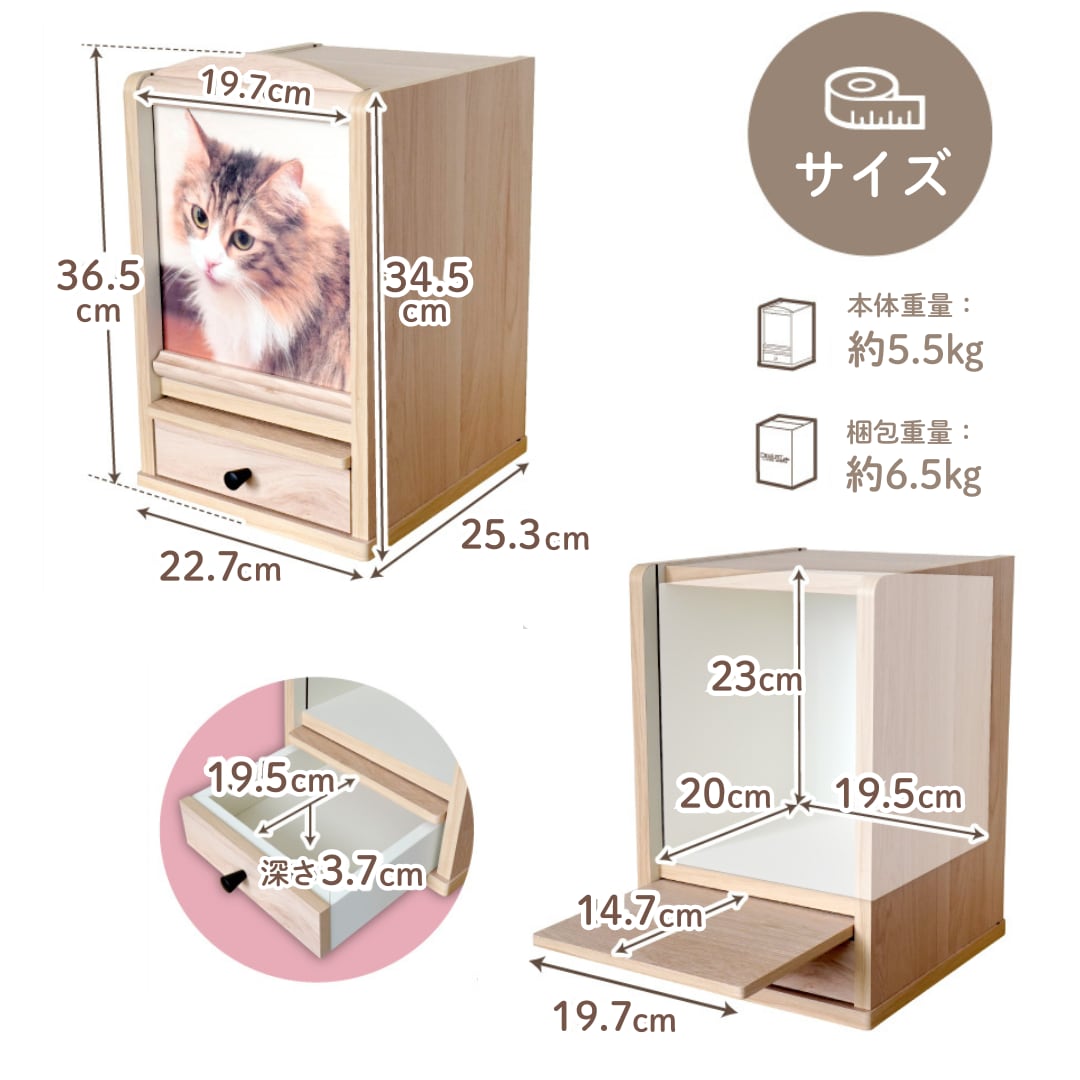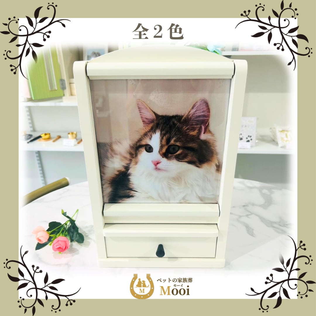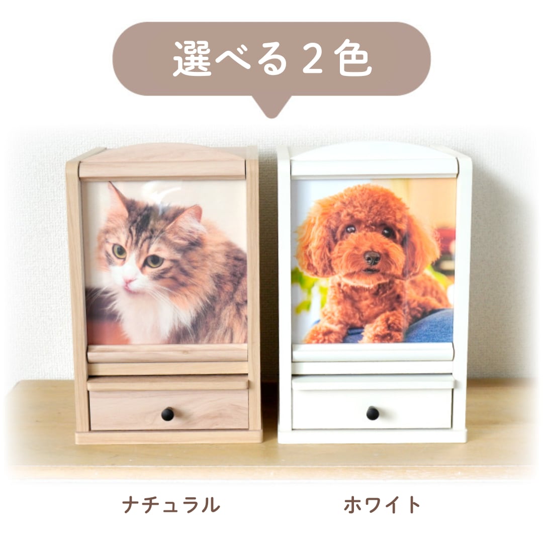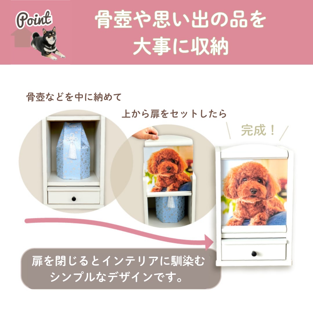 「使いやすさ」と「丈夫さ」にこだわってお作りした、シンプルでおしゃれなペット仏壇です。最大6寸サイズの骨壷をお納めいただけるほか 小さな骨壷なら複数個納めておける、ゆったりサイズですので ペットちゃんも安心してお休みいただけると思います。