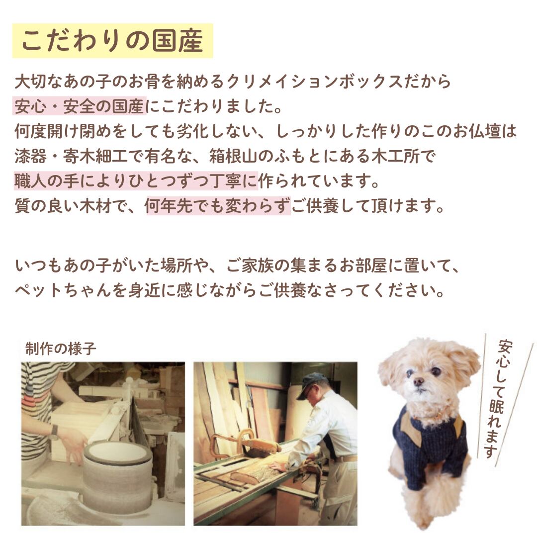 大事な家族を納めるペット仏壇だから、国産・上質なペット仏壇で、安心してご供養なさってください。