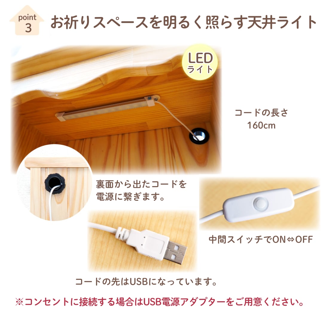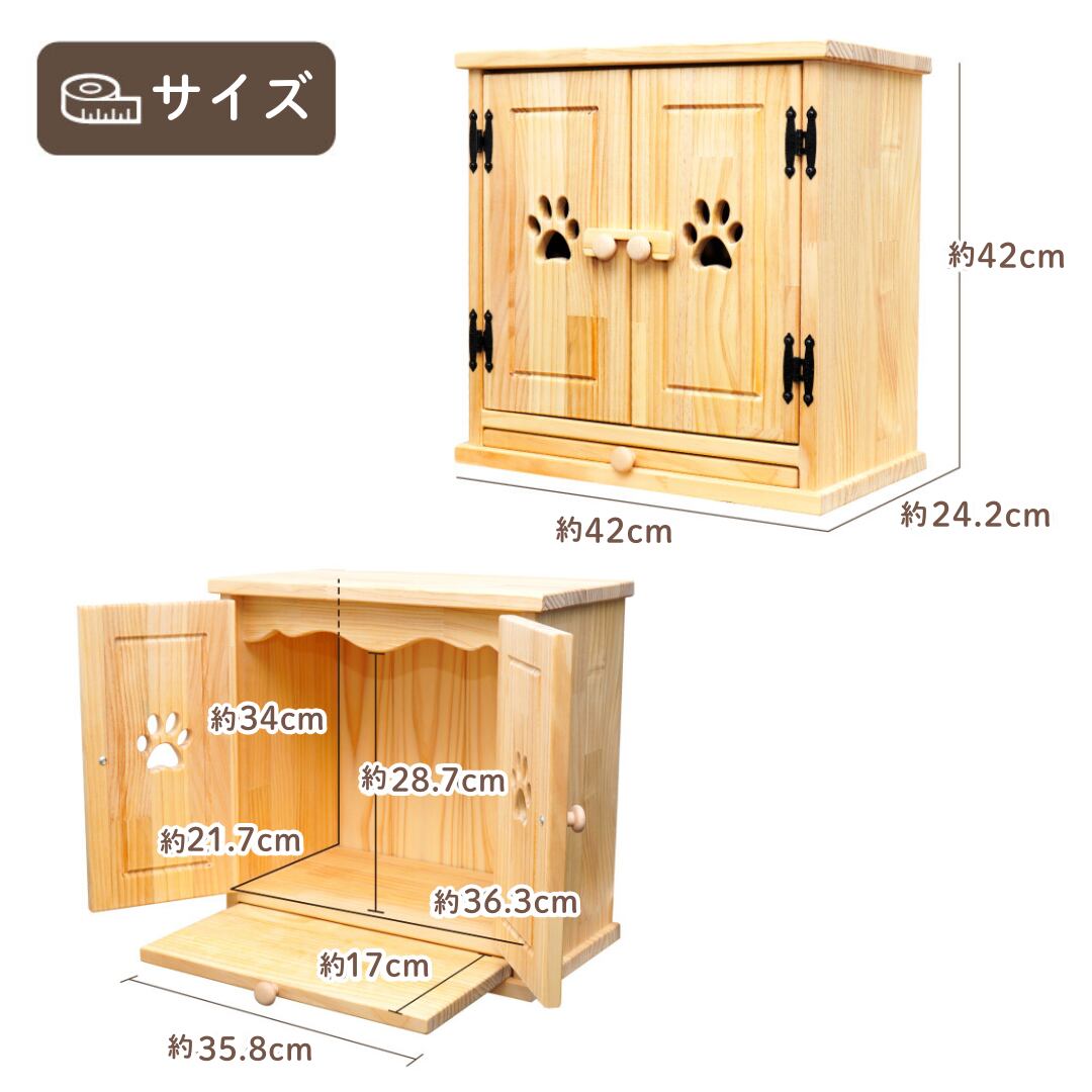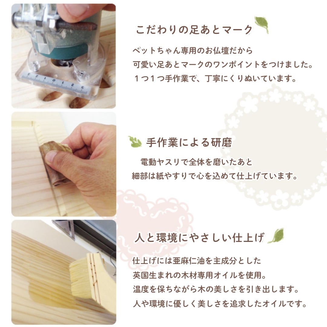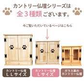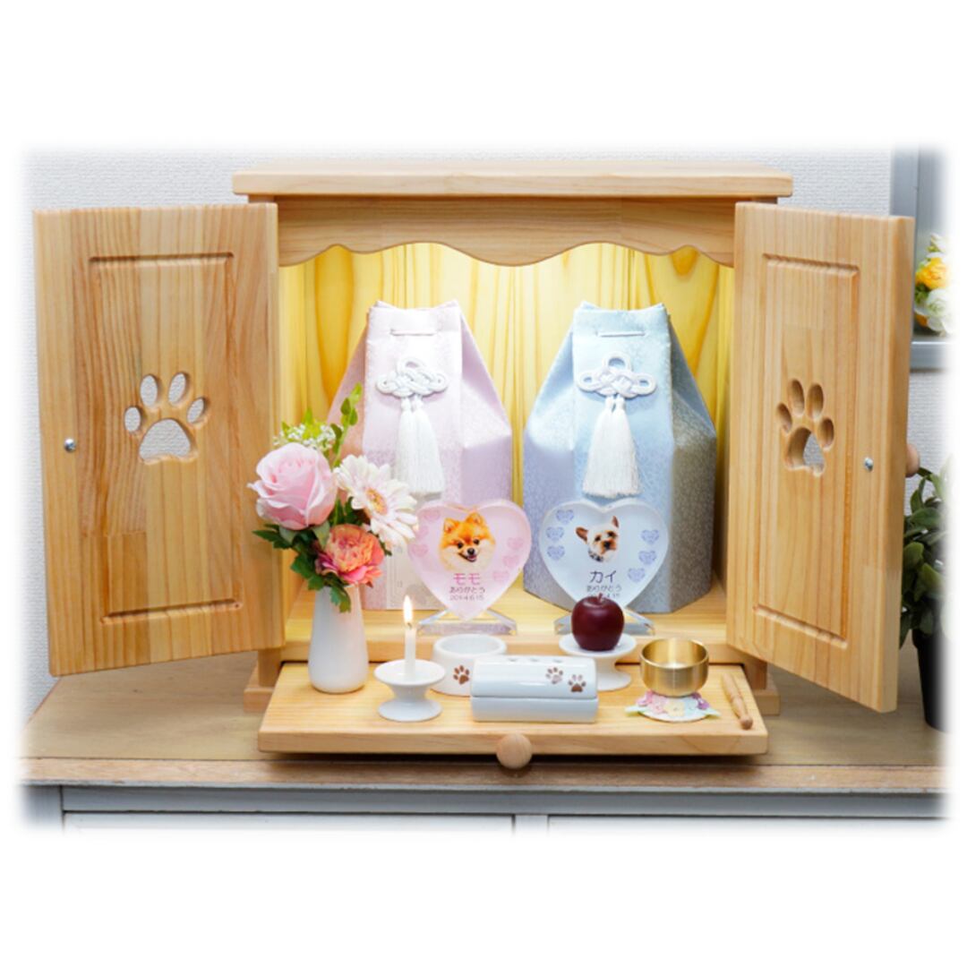 ナチュラルな雰囲気でお部屋にも合う、カントリー風のLEDライト付き手作り仏壇です。ゆったりサイズなので、複数のペットちゃんの骨壷や、大きめの骨壷も納められます。