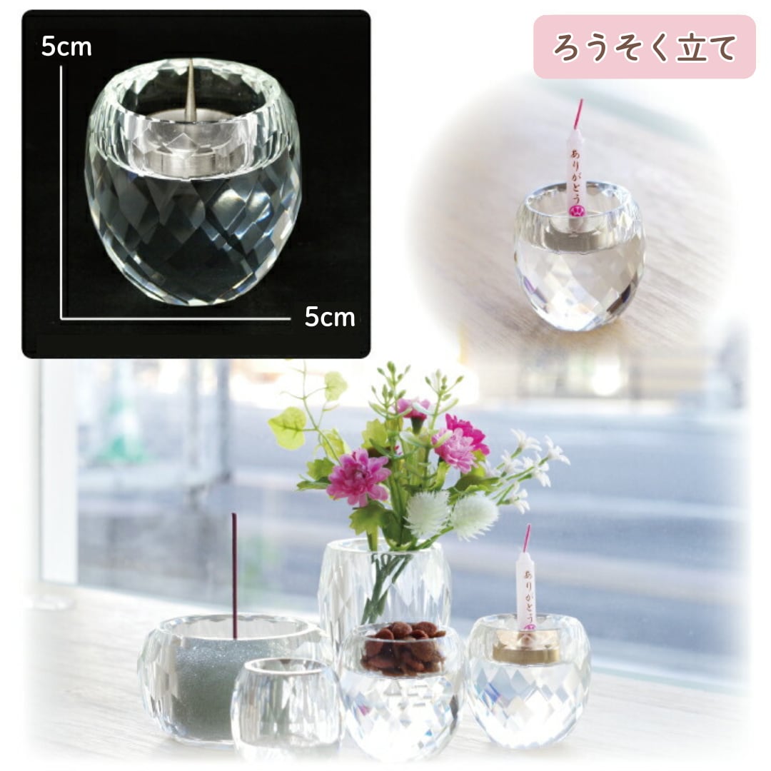 光が当たると輝く、カットが美しいガラス製のペット仏具のセットです。