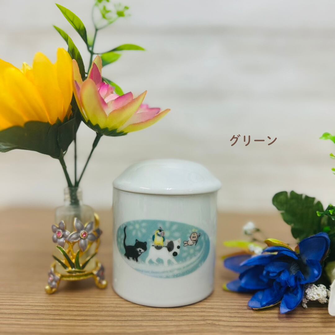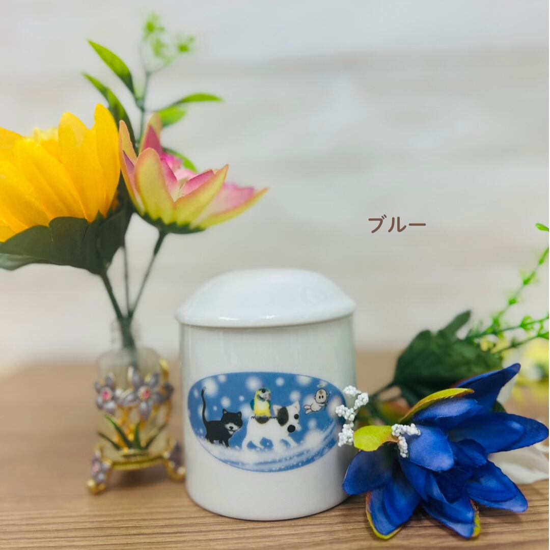 可愛い絵がプリントされた骨壺です。
