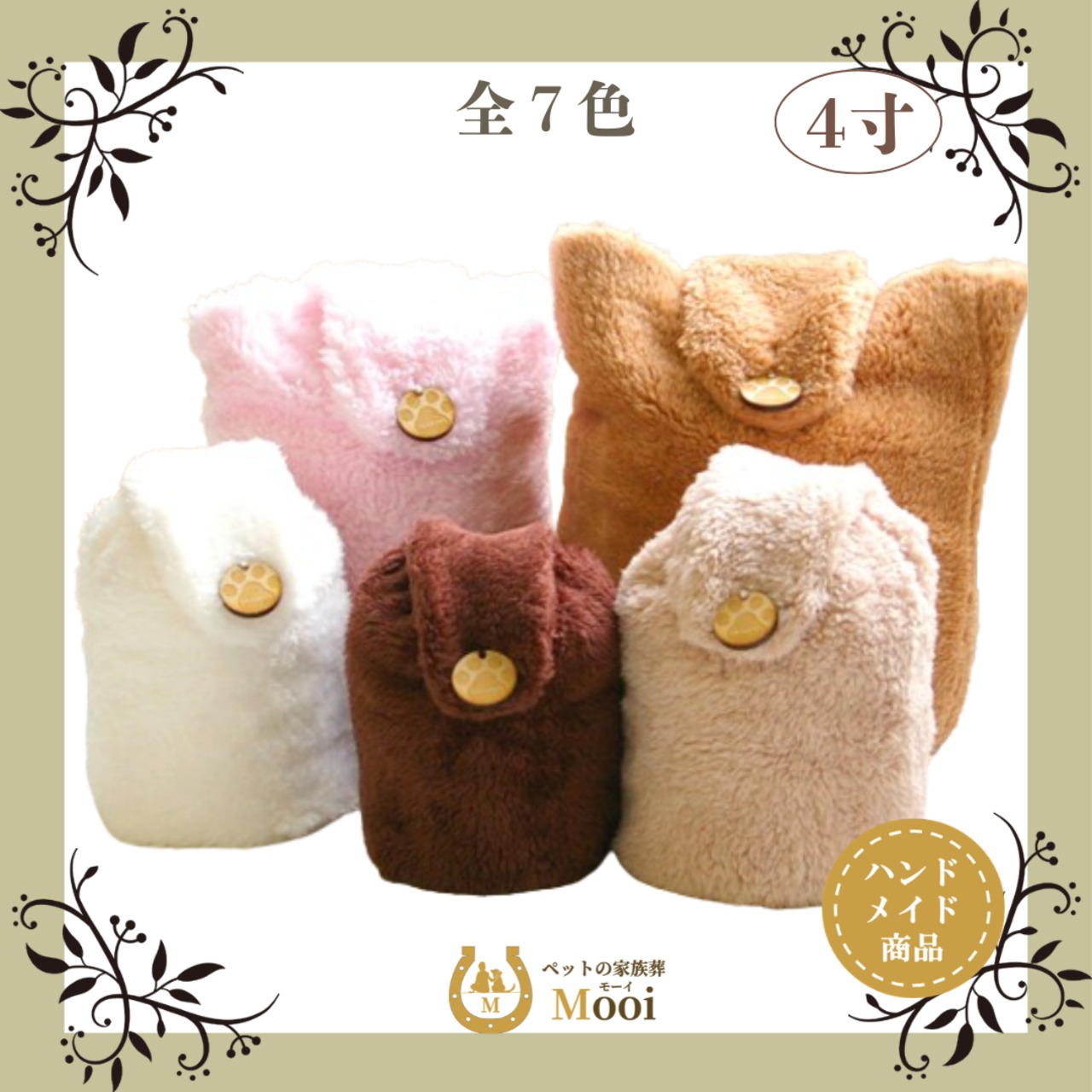 ハンドメイドでお作りするふんわりかわいい、ペット骨壷カバーです。もこもこ素材と足あと柄のボタンがポイントです。抱っこしてペットちゃんの重みと温かみを感じてください。
