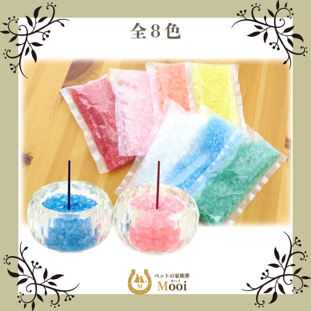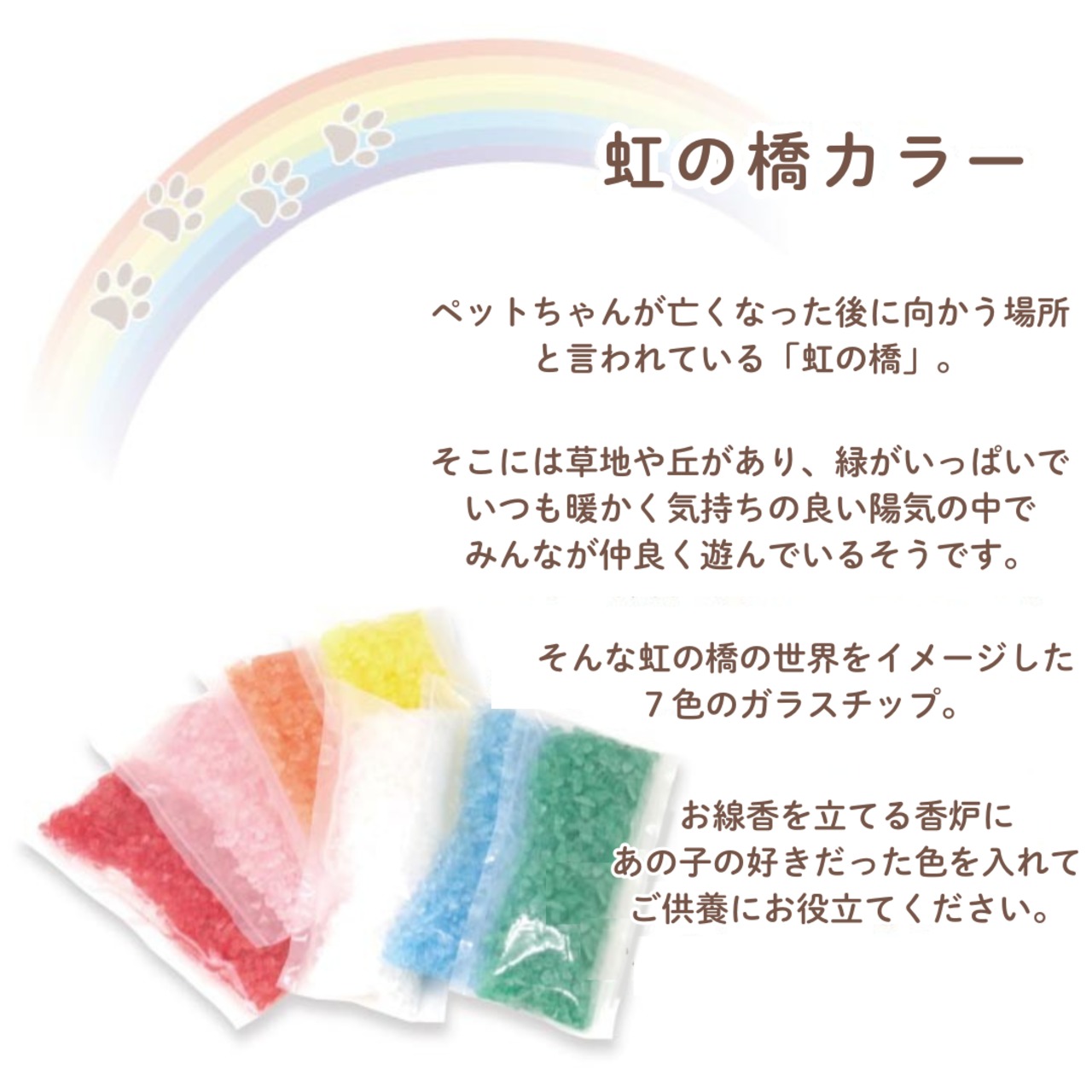 繰り返し使える香炉用ガラスチップです。「虹の橋」をイメージした8色をご用意しました。あの子のイメージカラーで選んで下さい。