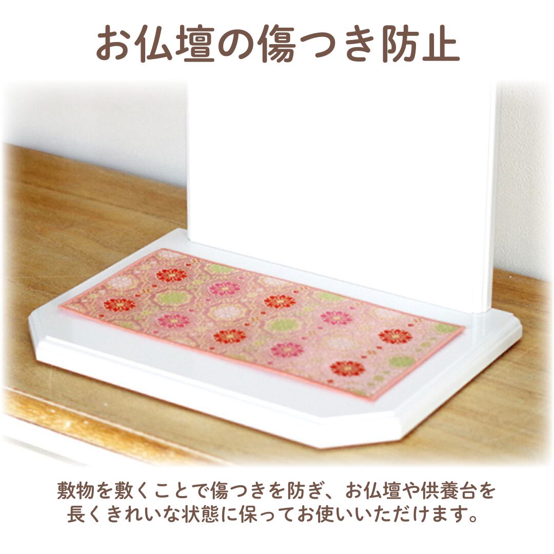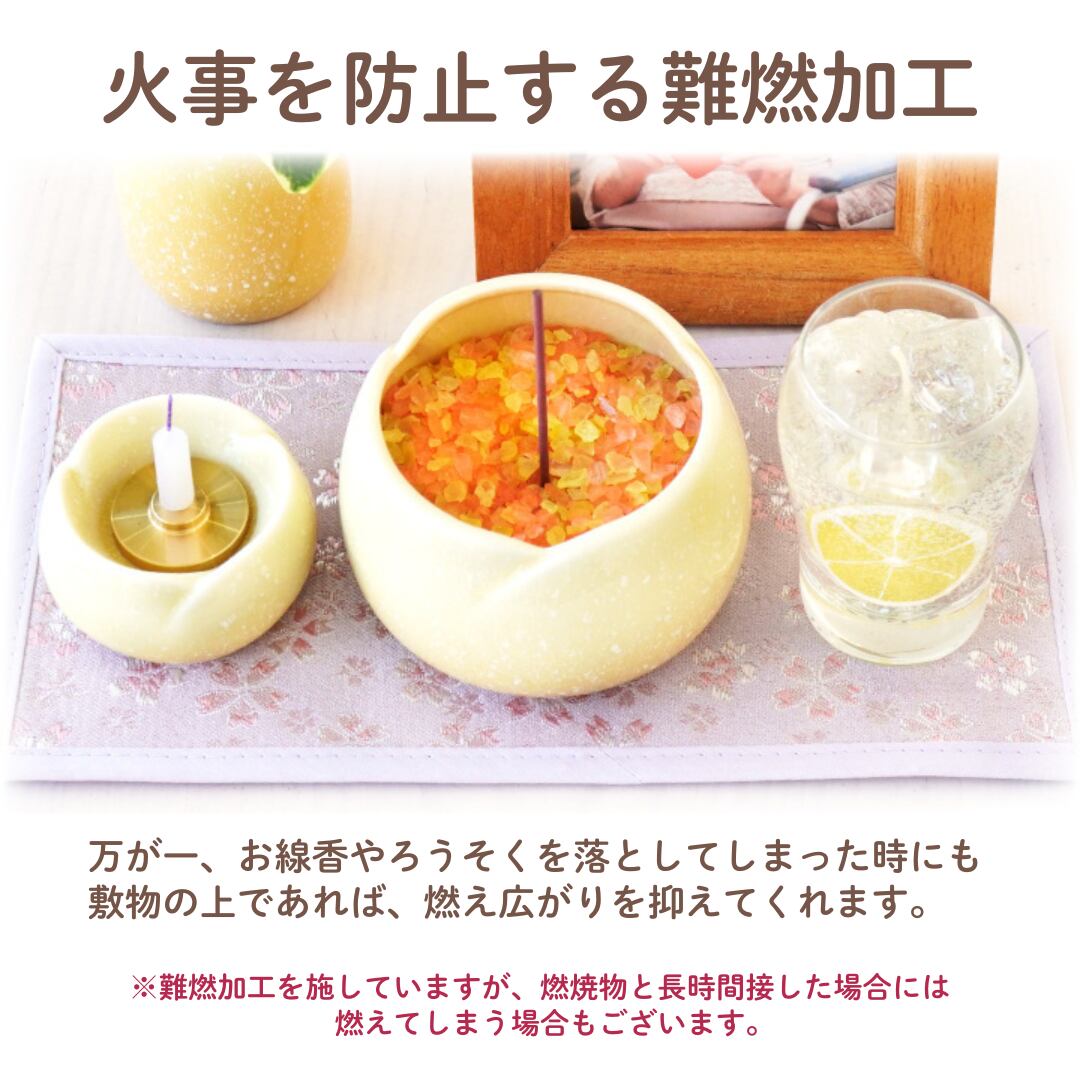 お花の柄が綺麗な不燃布使用のペット仏具用敷物です。 お仏壇を傷つけないように敷いていただいたり、お骨壷の前に置いて頂いたり、使い方は様々です。 柄がとても鮮やかなので、祈りの場がより一層華やかに。